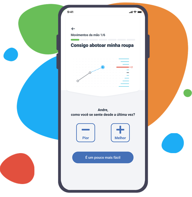 Acompanhe as mudanças percebidas pelos seus pacientes na capacidade de realizar ações nas atividades diárias, como movimentos das mãos, movimentos do corpo, corpo inteiro, alimentação, respiração e caminhada.